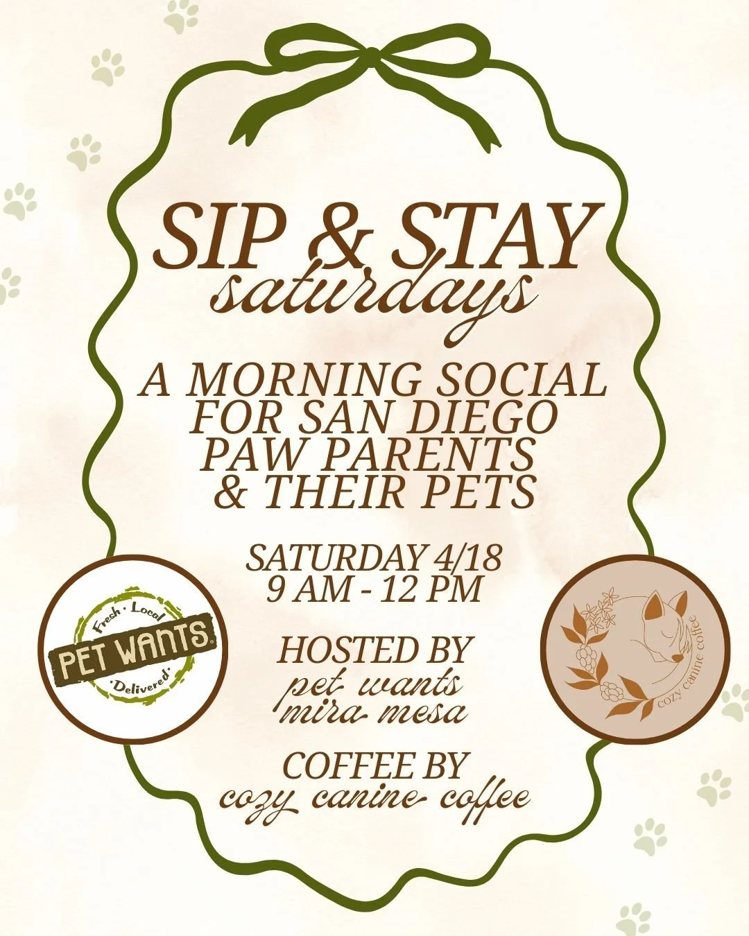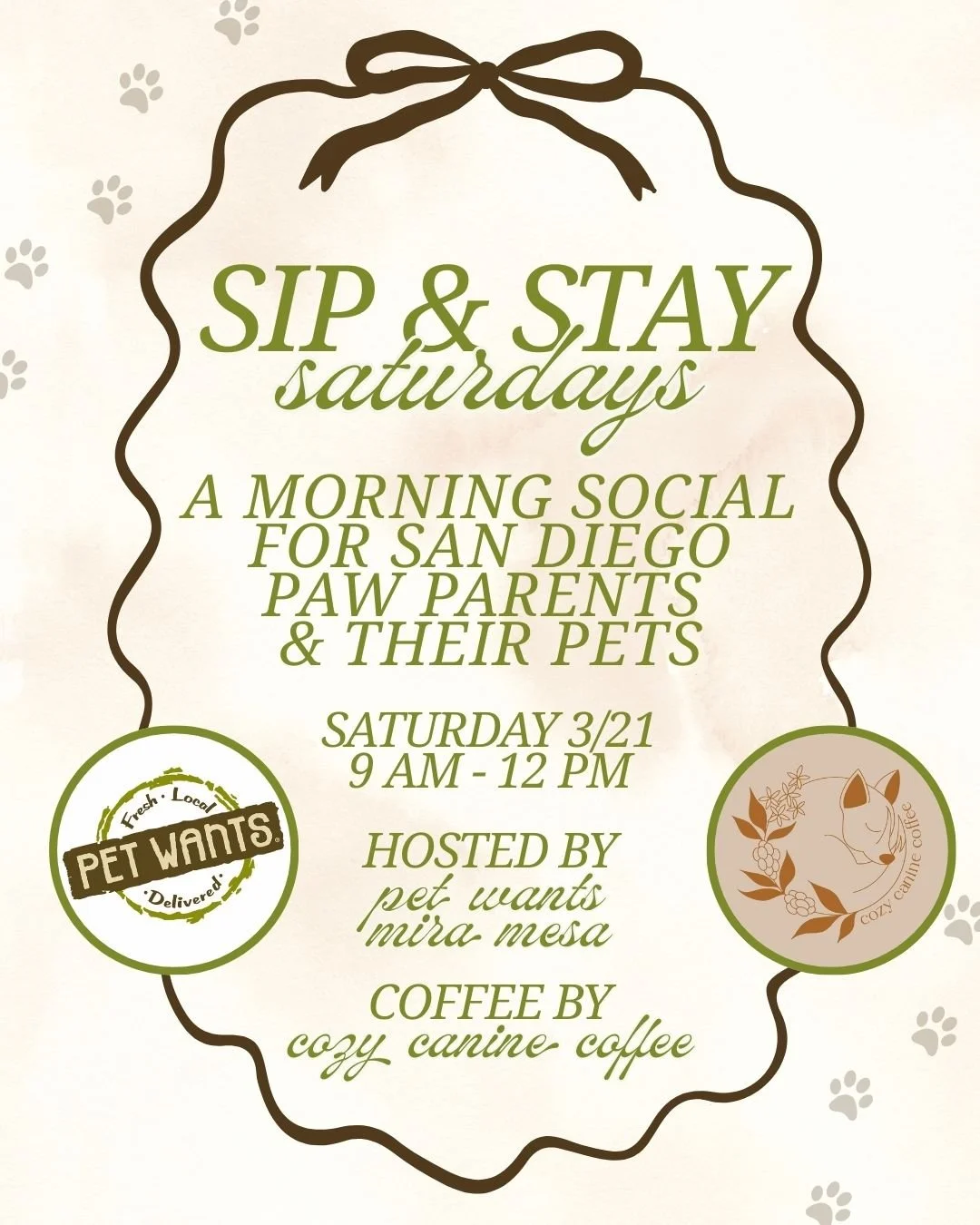 Join us for “Sip & Stay Saturdays” with Cozy Canine Coffee and Pet Wants Mira Mesa! A welcoming morning social for paw parents & their pets. 🐕🐈☕️🍵